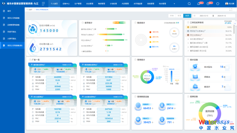 目前,“水管家統(tǒng)一平臺”已在三峽集團長江大保護項目中大顯身手,共覆蓋污水處理廠站125座(日污水處理能力總計258.1萬噸),供水廠站14座(日供水能力總計69.88萬噸),入庫管網(wǎng)達4萬公里,實現(xiàn)了水廠、農(nóng)污站點、泵站與調(diào)蓄池等管網(wǎng)附屬設(shè)施的遠程集中控制。