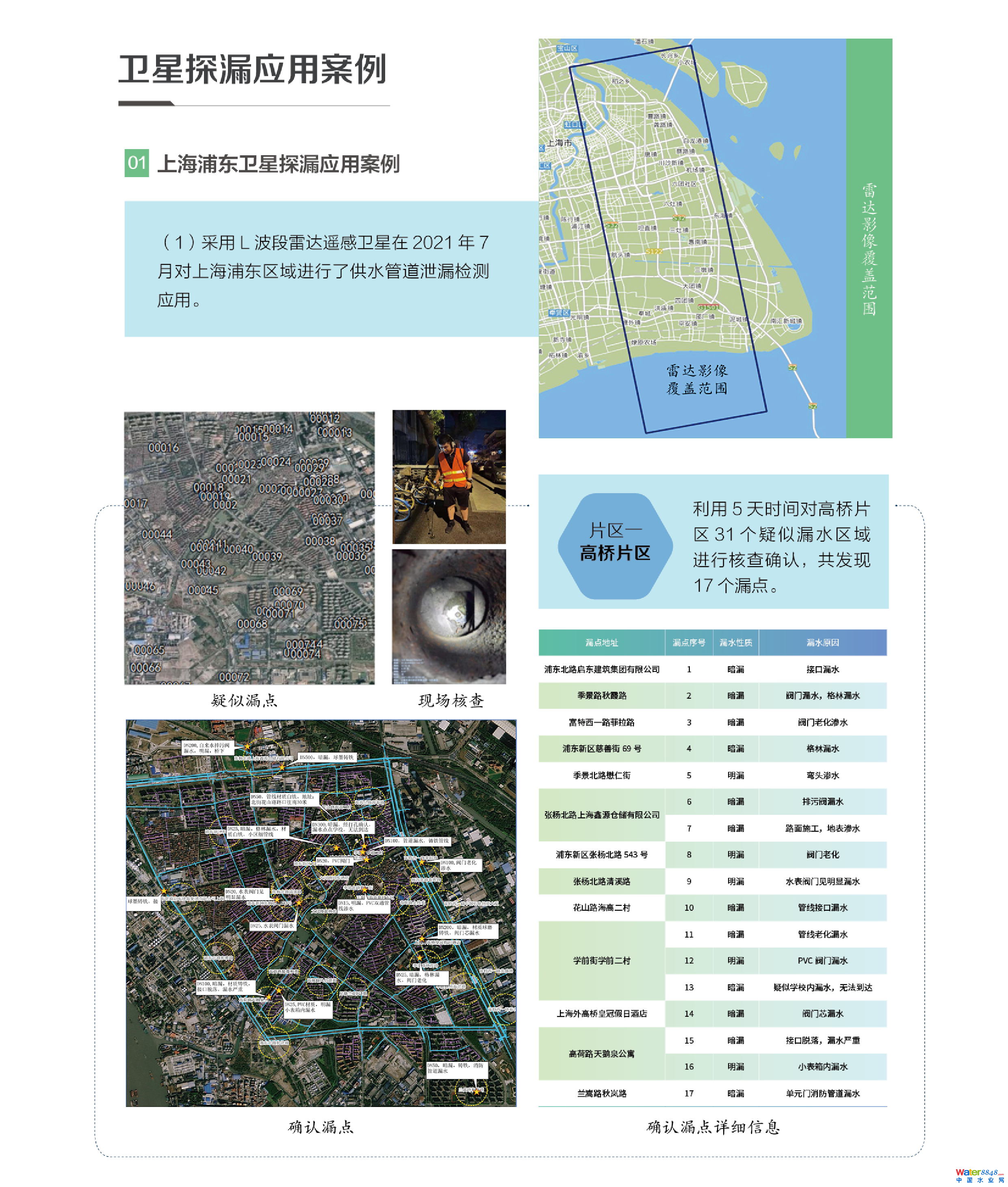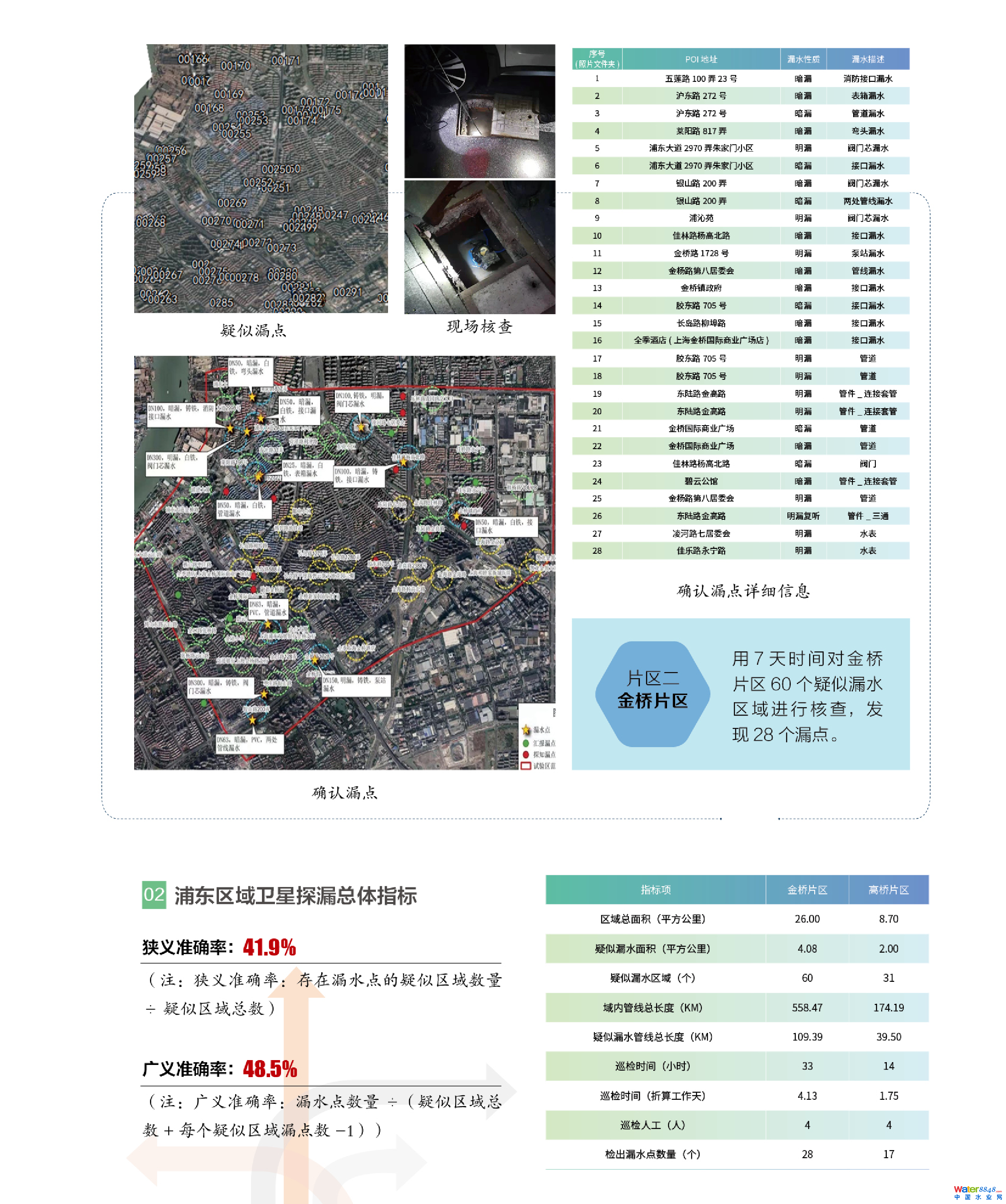 通過衛(wèi)星探漏+地面核查確認(rèn)進(jìn)行供水管網(wǎng)衛(wèi)星探漏服務(wù),高橋片區(qū)和金橋片區(qū)巡檢管道長度分別降至22%和19%,每人每天發(fā)現(xiàn)的漏點數(shù)分別提供20和15倍,每人每公里發(fā)現(xiàn)的漏點數(shù)提供16和9倍,大大提高檢漏效率、降低供水管網(wǎng)漏損率。