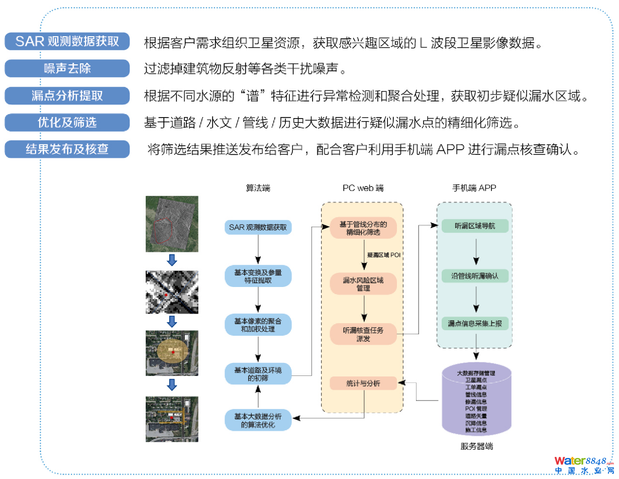 利用雷達(dá)的穿透性特點,采用長波段雷達(dá)衛(wèi)星掃描獲取整個城市的雷達(dá)遙感數(shù)據(jù),通過濾波、特征變換等算法模型分析管線泄露導(dǎo)致的土壤含水量差異,檢測識別出小范圍的疑似漏水區(qū)域,為地面檢漏核查提供準(zhǔn)確依據(jù)。