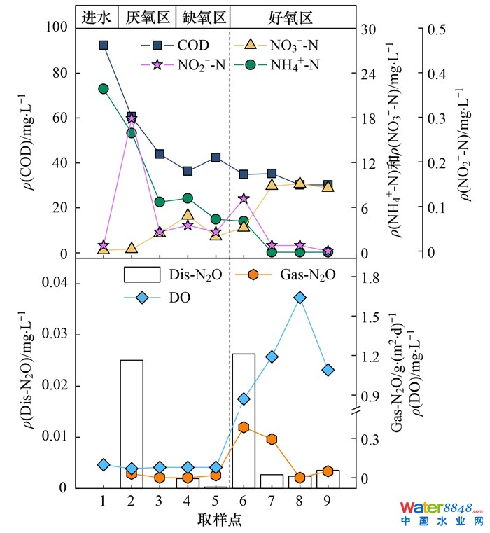圖 2 A2O工藝夏季NH4+-N、NO2--N、NO3--N、COD、DO與N2O典型變化Fig. 2 Variations in NH4+-N, NO2--N, NO3--N, COD, DO, and N2O concentrations during summer in A2O process |