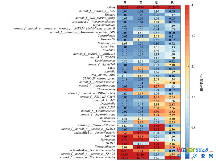 在屬水平上對相對豐度 > 1%的微生物物種組成進行分析, 結(jié)果如圖 5所示, 不同季節(jié)的優(yōu)勢菌屬存在明顯差異. 隨著氣溫的增高, 冬季相對豐度較高的norank_ f__norank_o__Saccharimonadales、norank_ f__norank_o__norank_c__SJA-28以及unclassified_o__Saccharimonadales等與有機物降解功能相關(guān)的菌屬相對豐度占比依次遞減. A2O工藝活性污泥中檢測到了多種反硝化菌屬, 冬季以Ferruginibacter(2.08%)、Ottowia(4.08%)和Thermomonas(3.77%)為主, 其中Thermomonas只在冬季具備較高的豐度占比, 其余季節(jié)時低于1%. 春季時Ferruginibacter(10.58%)在所有反硝化菌屬中占據(jù)絕對優(yōu)勢, 夏季時Ferruginibacter(5.03%)與Dokdonella(2.14%)是系統(tǒng)內(nèi)主要的反硝化菌屬, 秋季時反硝化菌屬最為豐富, 相對豐度大于1%的有Ferruginibacter、Ottowia、Dokdonella、Hyphomicrobium和Thauera. A2O活性污泥中寒冷季節(jié)的主要聚磷菌屬為Dechloromonas, 相對豐度在1%左右, 隨著氣溫上升, 豐度占比逐漸下降至0.50%. Tetrasphaera在夏季時的相對豐度有明顯增長, 在2.08%左右.