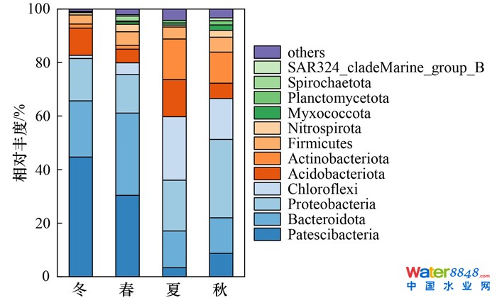 圖 4 A2O工藝不同季節(jié)門水平微生物群落結(jié)構(gòu)分布情況Fig. 4 Distribution of microbial community structure at phylum level in different seasons of A2O process |