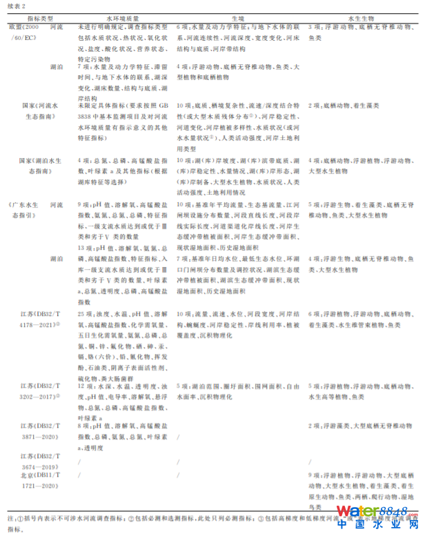 針對(duì)水環(huán)境質(zhì)量調(diào)查指標(biāo),有8項(xiàng)標(biāo)準(zhǔn)進(jìn)行了明確規(guī)定。其中江蘇《DB32/T4178—2021》要求的指標(biāo)數(shù)量最多,達(dá)到25項(xiàng),其次為《廣東水生態(tài)指引》,13項(xiàng)(湖泊13項(xiàng),河流9項(xiàng)),江蘇《DB32/T3202—2017》12項(xiàng),江蘇《DB32/T3871—2020》8項(xiàng),美國(guó)《河溪快速生物評(píng)價(jià)規(guī)程》7項(xiàng),國(guó)家《湖泊水生態(tài)指南》4項(xiàng)(其他指標(biāo)根據(jù)湖庫(kù)特征選擇)。從具體指標(biāo)來(lái)看,八項(xiàng)標(biāo)準(zhǔn)大多要求對(duì)河流或湖泊的pH值、溶解氧、高錳酸鹽指數(shù)、總磷、氨氮、總氮和葉綠素a等7項(xiàng)指標(biāo)進(jìn)行調(diào)查。指標(biāo)要求詳見(jiàn)表2。