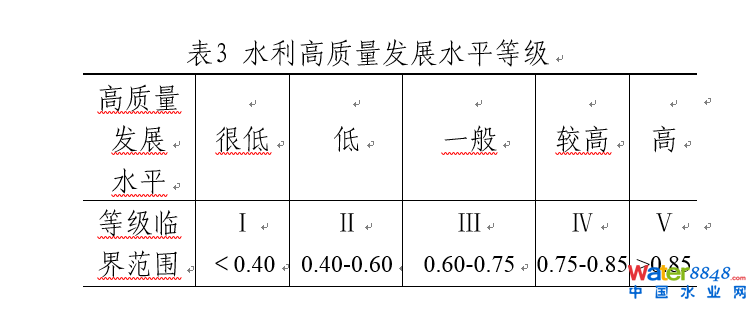 水利高質(zhì)量發(fā)展指數(shù)=∑指標得分×權(quán)重(1)式中,水利高質(zhì)量發(fā)展指數(shù)滿分為1。同時,將水利高質(zhì)量發(fā)展指數(shù)水平劃分為五級,具體如表3所列。