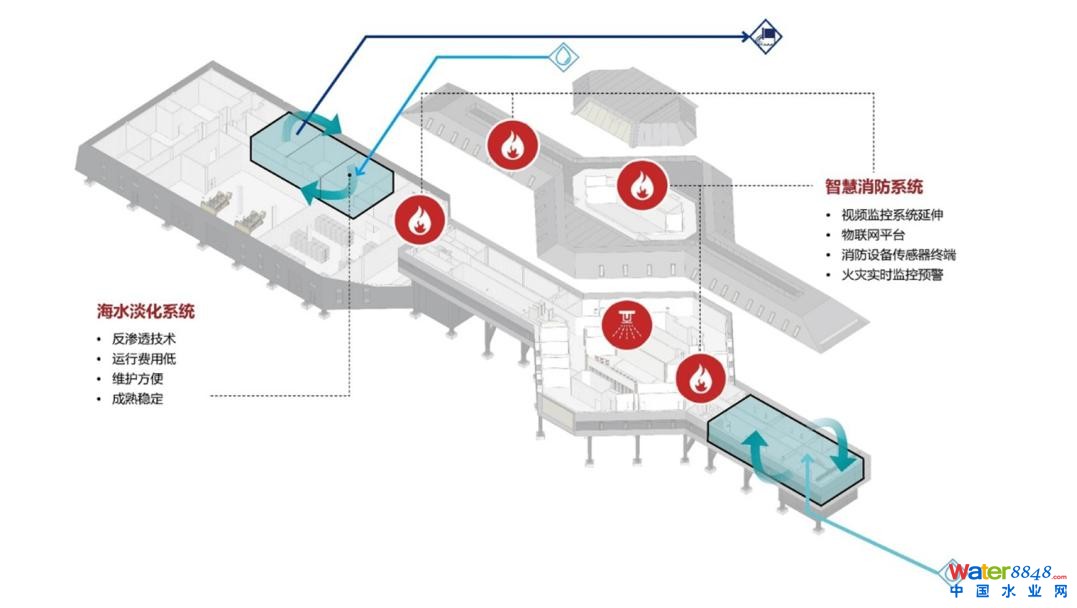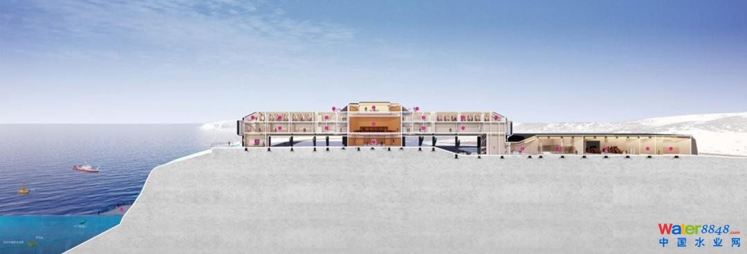秦嶺站的水資源利用充分考慮了地形和洋流條件,采用適應多種工況的海水、融雪等采集和處理方式。取水口采用近岸深井方式,避免海冰侵擾影響,實驗用海洋原水相對獨立采集與處理,生活用淡化系統(tǒng)采用多層級過濾與反滲透工藝,存用結(jié)合,保障用水的潔凈與安全;生活污水采用膜生物處理系統(tǒng),配以一體化膜生物反應器降解處理,達到南極排放標準。