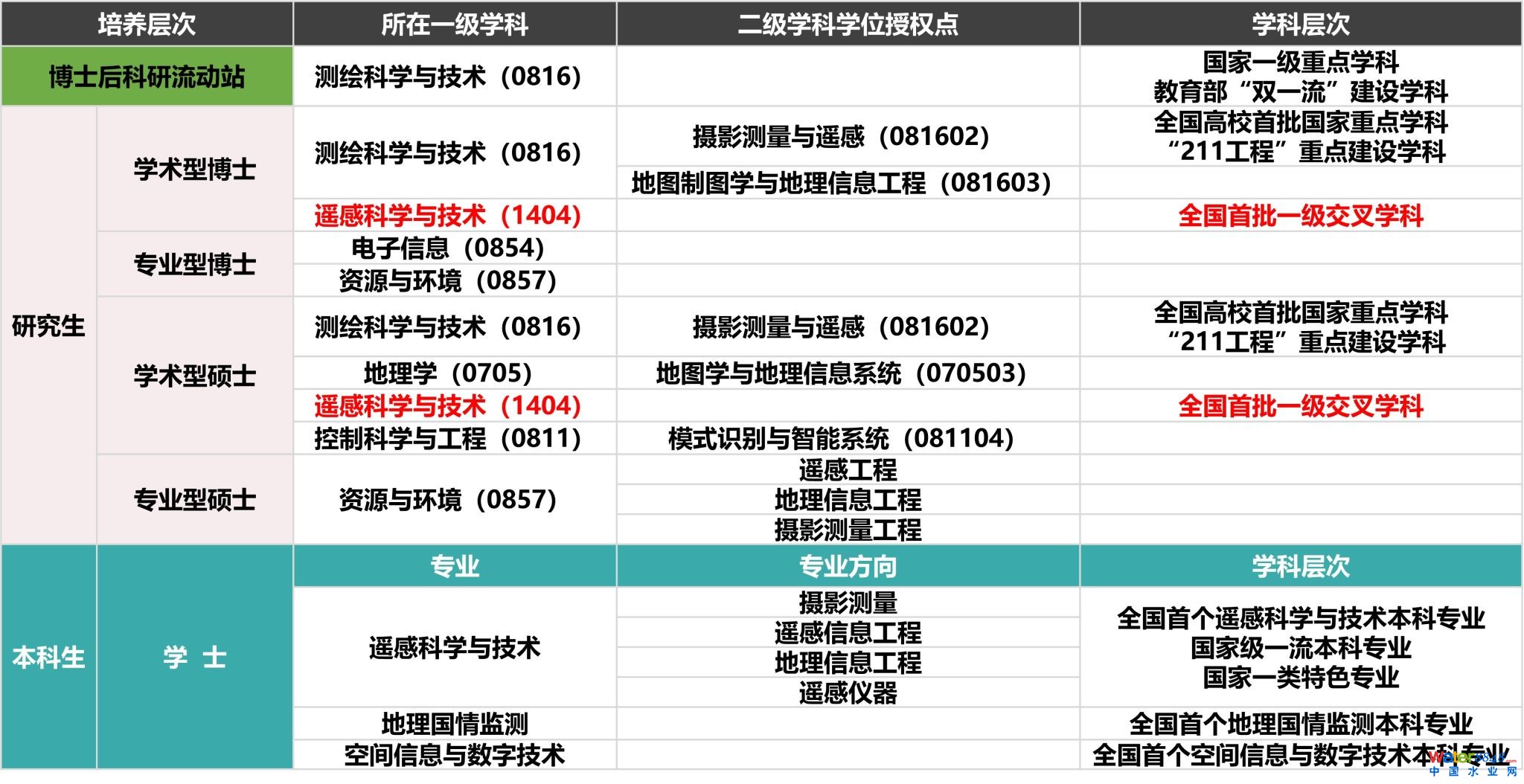 學(xué)院現(xiàn)有“遙感科學(xué)與技術(shù)”、“地理國(guó)情監(jiān)測(cè)”、“空間信息與數(shù)字技術(shù)”3個(gè)本科專業(yè),“攝影測(cè)量與遙感”、“地圖學(xué)與地理信息系統(tǒng)”、“模式識(shí)別與智能系統(tǒng)”、“遙感科學(xué)與技術(shù)”4個(gè)科學(xué)碩士學(xué)位授權(quán)點(diǎn)以及“資源與環(huán)境”工程碩士專業(yè)學(xué)位授權(quán)點(diǎn),“攝影測(cè)量與遙感”、“地圖制圖學(xué)與地理信息工程”、“遙感科學(xué)與技術(shù)”3個(gè)博士學(xué)位授權(quán)點(diǎn)以及“測(cè)繪科學(xué)與技術(shù)”博士后科研流動(dòng)站。其中,“遙感科學(xué)與技術(shù)專業(yè)”是國(guó)家一流本科專業(yè),“攝影測(cè)量與遙感”是國(guó)家教育部審定的首批全國(guó)重點(diǎn)學(xué)科、“211工程”一期到三期重點(diǎn)建設(shè)學(xué)科,其所屬的“測(cè)繪科學(xué)與技術(shù)”為國(guó)家一級(jí)重點(diǎn)學(xué)科,2017年入選教育部“雙一流”建設(shè)學(xué)科。2018年,“遙感科學(xué)與技術(shù)”獲批首批博士學(xué)位授權(quán)交叉學(xué)科,2022年,“遙感科學(xué)與技術(shù)”正式作為一級(jí)學(xué)科列入教育部學(xué)科專業(yè)目錄。