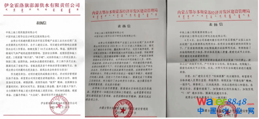 ▲項目組先后收到來自伊金霍洛旗澎源供水公司和內(nèi)蒙古自治區(qū)鄂爾多斯蒙蘇經(jīng)濟開發(fā)區(qū)建設管理局的表揚信