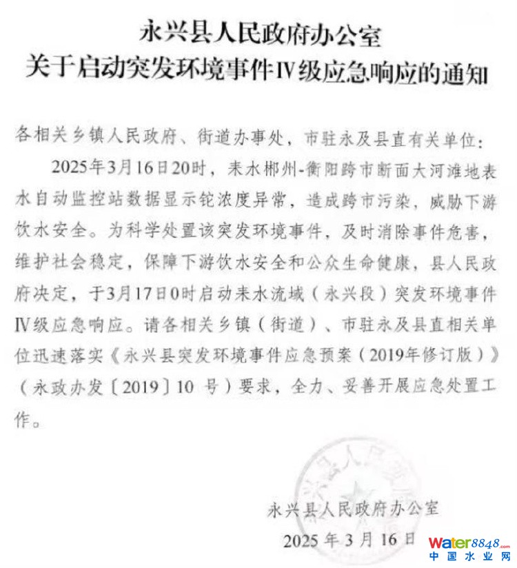 該通知提到,為科學處置該突發(fā)環(huán)境事件,及時消除事件危害,保障下游飲水安全和公眾生命健康,永興縣政府決定于3月17日0時啟動耒水流域(永興段)突發(fā)環(huán)境事件Ⅳ級級應急響應。
