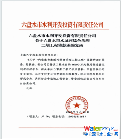 近日,巴安水務(wù)在企業(yè)公眾號以《貴州省六盤水水投仗勢欺人,確認(rèn)的款項(xiàng),卻當(dāng)庭不承認(rèn)!》為題披露,2024年9月25日收到六盤水市水利開發(fā)投資有限責(zé)任公司“關(guān)于六盤水市水城河綜合治理二期工程催款函的復(fù)函 ”,其中載明六盤水市水投公司已將未付46690萬元費(fèi)用報(bào)送登記到省金控平臺(tái)。其中近2.5億為雙方確認(rèn)的利息,此債務(wù)僅截止到 2022年9月30號。而近日,六盤水市中級人民法院的開庭活動(dòng)上,六盤水投資公司的法務(wù)人員當(dāng)場不承認(rèn)該公司由黨委會(huì)上會(huì)決定的上述催款函的復(fù)函中關(guān)于單利近2.5億的欠債。