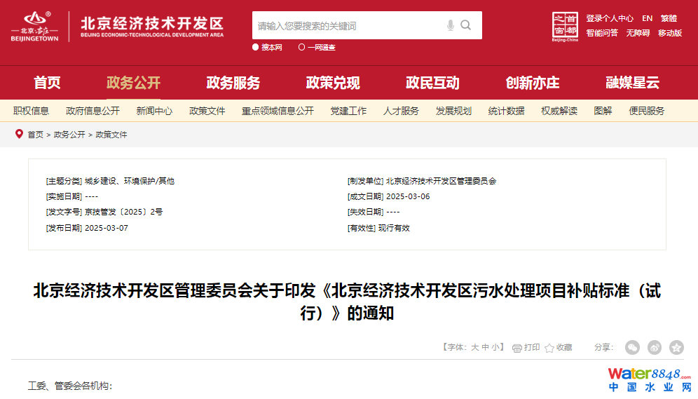 《北京經(jīng)濟(jì)技術(shù)開發(fā)區(qū)污水處理項目補貼標(biāo)準(zhǔn)(試行)》發(fā)布