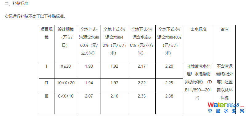 • 對于設(shè)計規(guī)模大于等于20萬立方米/日的項目,補貼費率根據(jù)污泥含水率和出水標(biāo)準(zhǔn)有所不同,最高補貼費率為每立方米2.20元。