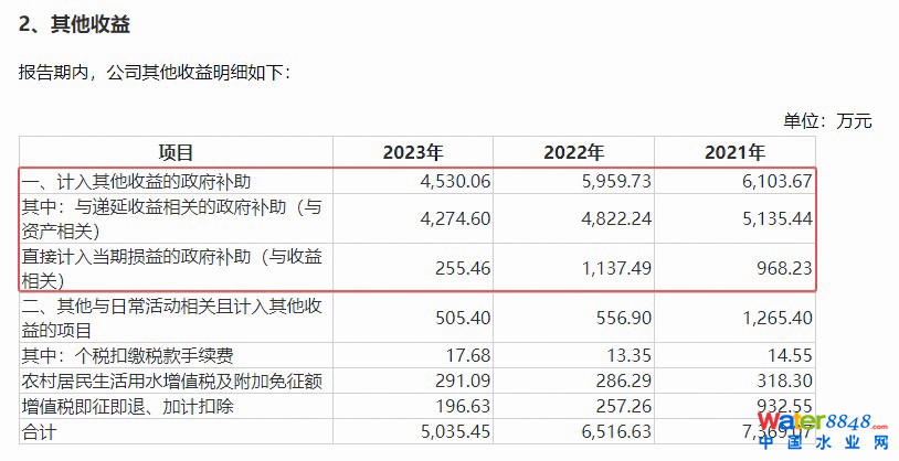 而且,政府補(bǔ)助構(gòu)成的遞延收益堪稱環(huán)保企業(yè)的業(yè)績蓄水池,遞延收益的釋放情況對業(yè)績影響同樣不容小覷。佛水環(huán)保的期內(nèi)遞延收益均為政府補(bǔ)助,2020年至2023年分別為45817.26萬元、44186.60萬元、44365.49萬元和42380.63萬元,同期歸母凈利潤分別為2.54億元、3.31億元、3.14億元和2.98億元,每年的遞延收益均相當(dāng)于同期歸母凈利潤的130%—180%。事實(shí)上,在佛水環(huán)保報(bào)告期內(nèi)的其他收益中,與遞延收益相關(guān)的政府補(bǔ)助便占絕對大頭(見圖一)。