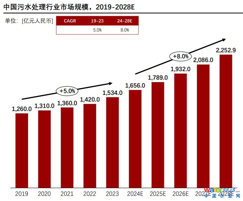 預(yù)計2024-2028年,污水處理市場規(guī)模逐年遞增,并在2028年達到2,252.9億元人民幣,年均復(fù)合增長率為8%。
