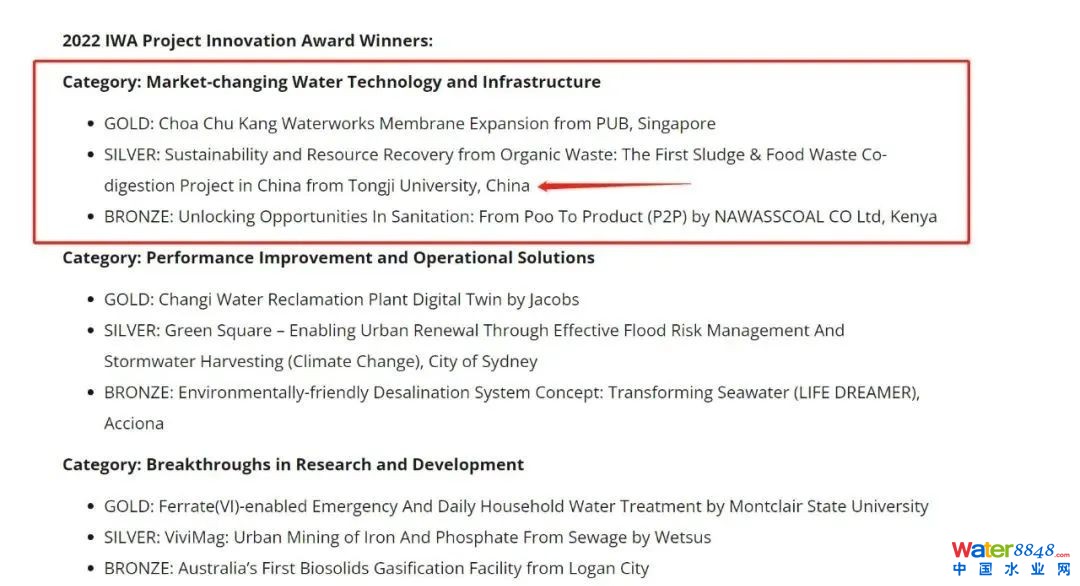 在近日于丹麥哥本哈根舉行的2022年國(guó)際水協(xié)會(huì)(International Water Association,IWA)世界水大會(huì)暨展覽會(huì)上,IWA項(xiàng)目創(chuàng)新獎(jiǎng)(Project Innovation Awards,PIA)頒授,由同濟(jì)大學(xué)環(huán)境科學(xué)與工程學(xué)院戴曉虎教授團(tuán)隊(duì)牽頭,同濟(jì)大學(xué)、上海市政工程設(shè)計(jì)研究總院、鎮(zhèn)江市水業(yè)有限責(zé)任公司、上海同濟(jì)普蘭德生物質(zhì)能股份有限公司、德國(guó)布倫瑞克工業(yè)大學(xué)聯(lián)合完成的項(xiàng)目“基于協(xié)同厭氧消化的市政污泥與餐廚垃圾等有機(jī)廢棄物可持續(xù)資源利用處理技術(shù)及模式”斬獲國(guó)際銀獎(jiǎng)。此次項(xiàng)目創(chuàng)新獎(jiǎng)設(shè)有6個(gè)類別,每個(gè)類別設(shè)金銀銅獎(jiǎng)各一名。全球共有18個(gè)項(xiàng)目獲獎(jiǎng),中國(guó)有2個(gè)項(xiàng)目獲銀獎(jiǎng)。