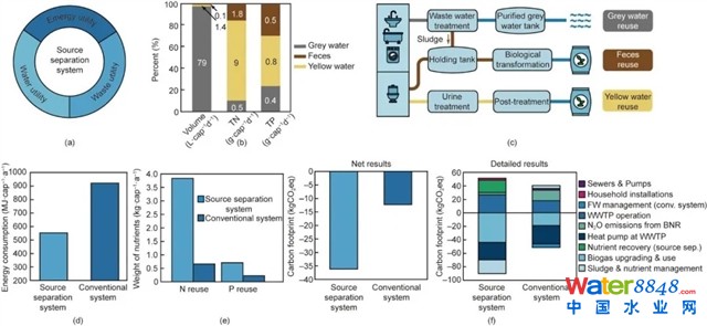 DWS 的建設(shè)為污水源頭分離奠定了基礎(chǔ)。源分離需要多領(lǐng)域與部門配合,可促進(jìn)能源回收、水處理及廢物利用等領(lǐng)域合作。通過分析灰水、黃水以及糞便的體積、總氮(TN)和總磷(TP)分布,能發(fā)現(xiàn)源分離具有極大的資源回收潛力;宜倮每尚纬稍偕,黃水與糞便回收可用于肥料生產(chǎn)。相較于傳統(tǒng)集中式水系統(tǒng),源分離簡(jiǎn)化了水質(zhì)復(fù)雜性,降低了后續(xù)水處理的能耗和碳排放,同時(shí)促進(jìn)了水中氮、磷資源的回收。