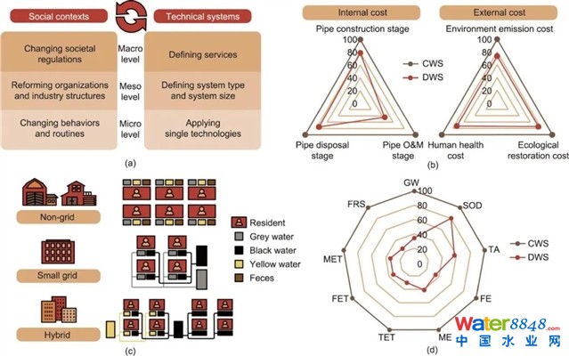 分散式水系統(tǒng)(DWS)是實(shí)現(xiàn)可持續(xù)城市供水系統(tǒng)的基礎(chǔ)。與傳統(tǒng)集中式系統(tǒng)相比,DWS 由無傳統(tǒng)地下管網(wǎng)(家庭或農(nóng)村地區(qū))、小型地下管網(wǎng)(街區(qū))和混合地下管網(wǎng)(大型社區(qū))組成。研究從社會(huì)環(huán)境、技術(shù)、成本、實(shí)施策略與環(huán)境影響多個(gè)方面對(duì)其進(jìn)行了探討。社會(huì)環(huán)境方面,制度框架、治理結(jié)構(gòu)以及個(gè)人習(xí)慣等因素決定著能否獲得各方正向反饋;技術(shù)層面需考慮水系統(tǒng)技術(shù)目標(biāo)、空間結(jié)構(gòu)與管控方式等;成本上,DWS 的內(nèi)部成本(管道建設(shè)、處置和運(yùn)行維護(hù)等直接經(jīng)濟(jì)支出)和外部成本(環(huán)境排放、人體健康和生態(tài)修復(fù)等間接影響)相較于集中式水系統(tǒng)(CWS)更低;實(shí)施策略上,考慮到管理難度、用戶接受度、技術(shù)選擇和重置成本,無管網(wǎng)和小規(guī)模管網(wǎng)系統(tǒng)因技術(shù)鎖定效應(yīng)更適合建設(shè) DWS;環(huán)境影響方面,DWS 的平均環(huán)境影響比 CWS 低 56%,在化石資源類別中,DWS 的環(huán)境影響僅為 CWS 的 25.2% ,顯示出其在減少有機(jī)物排放和節(jié)約能源方面的優(yōu)勢(shì)。