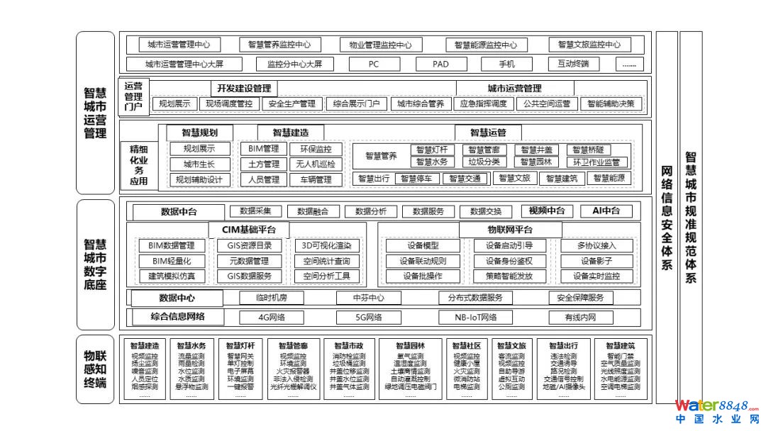 以“打牢共用、整合通用、開(kāi)放應(yīng)用”理念為指引,提出南部新城智慧城市“物聯(lián)感知終端、智慧城市數(shù)字底座、智慧城市運(yùn)營(yíng)管理、標(biāo)準(zhǔn)規(guī)范體系和信息安全體系”三橫兩縱的系統(tǒng)架構(gòu),如圖1所示。