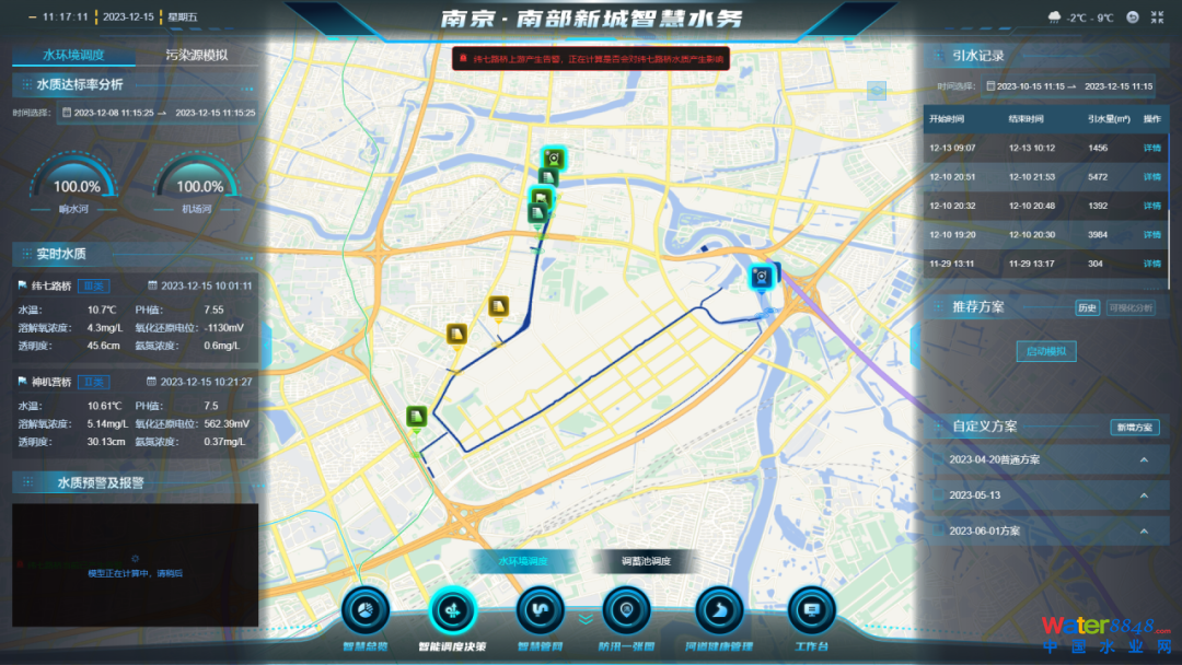 水環(huán)境調(diào)度重點(diǎn)展示響水河泵站、機(jī)場(chǎng)河泵站水質(zhì)達(dá)標(biāo)率以及緯七路橋?qū)崟r(shí)水質(zhì)相關(guān)信息。當(dāng)緯七路橋站點(diǎn)發(fā)生水質(zhì)報(bào)警,系統(tǒng)將自動(dòng)啟動(dòng)模型計(jì)算,并展示模型推薦調(diào)度方案,可通過(guò)自定義方案模塊進(jìn)行自定義方案輸入,查看執(zhí)行對(duì)應(yīng)方案后可能出現(xiàn)的水質(zhì)效果。同時(shí),可以添加未來(lái)降雨數(shù)據(jù)來(lái)優(yōu)化調(diào)度結(jié)果的準(zhǔn)確性。當(dāng)緯七路橋上游站點(diǎn)發(fā)生水質(zhì)報(bào)警,系統(tǒng)自動(dòng)啟動(dòng)模型進(jìn)行計(jì)算,確定上游水質(zhì)是否會(huì)對(duì)緯七路橋水質(zhì)產(chǎn)生影響。如果產(chǎn)生影響,則展示模型推薦調(diào)度方案以及自定義方案,查看執(zhí)行對(duì)應(yīng)方案后可能出現(xiàn)的水質(zhì)效果,支持兩個(gè)方案做對(duì)比展示。水務(wù)環(huán)境調(diào)度如圖10所示。