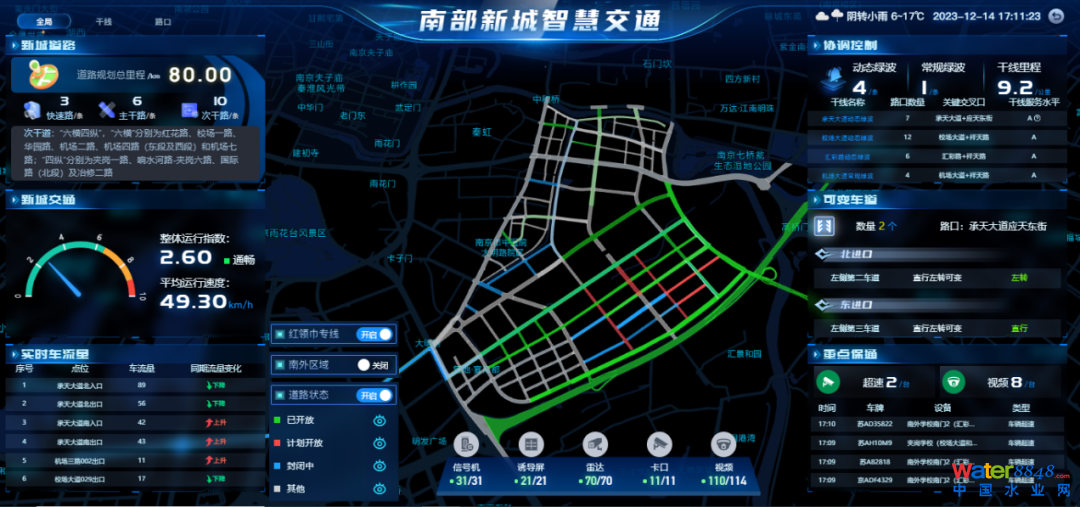 圍繞承天大道、校場(chǎng)大道等主要路段,南外學(xué)校周邊道路,建設(shè)完善交通感知監(jiān)測(cè)、智能信號(hào)燈、信息屏等智慧交通基礎(chǔ)設(shè)施。搭建智慧管控平臺(tái),依托采集到的實(shí)時(shí)交通大數(shù)據(jù),實(shí)時(shí)在線交通推演,即時(shí)生成交通應(yīng)急方案,助力新城交通管控。智慧交通應(yīng)用如圖6所示。