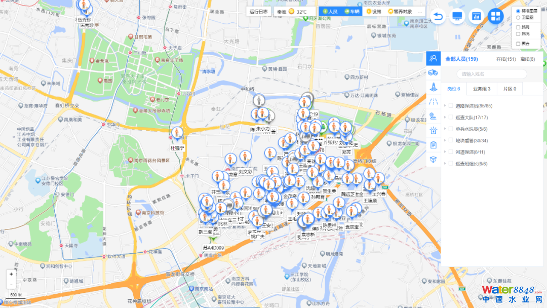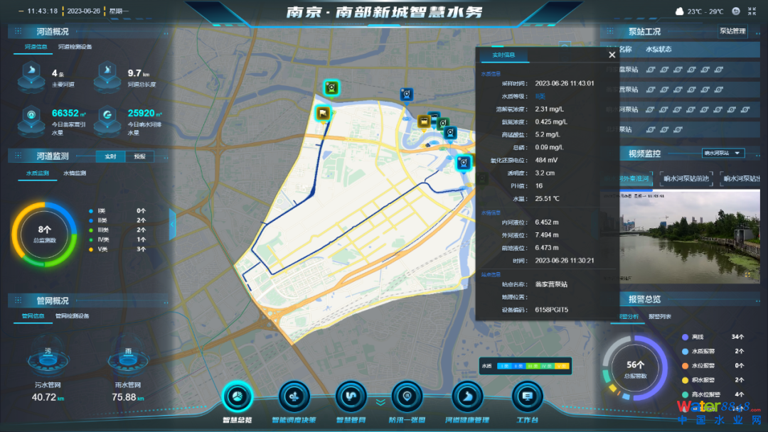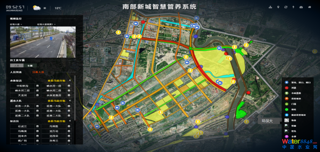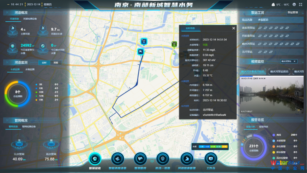 在水務(wù)業(yè)務(wù)管理方面,南部新城基于CIM和調(diào)水模型實(shí)現(xiàn)水務(wù)管理。通過(guò)采集河道泵站、排口、自流涵的水位和流量信息,根據(jù)流速、流量、水質(zhì)信息并基于“水文-水質(zhì)-水動(dòng)力”機(jī)理建立水調(diào)度模型,通過(guò)調(diào)水實(shí)驗(yàn)統(tǒng)計(jì)調(diào)水量、水質(zhì)變化情況等數(shù)據(jù)建立支持向量機(jī)(SVM)模型,將機(jī)理模型和統(tǒng)計(jì)模型相結(jié)合支撐水調(diào)度管理,并結(jié)合CIM技術(shù)可視化展示水調(diào)度過(guò)程,保障區(qū)域內(nèi)河水質(zhì)達(dá)標(biāo)。水務(wù)綜合管理如圖9所示。