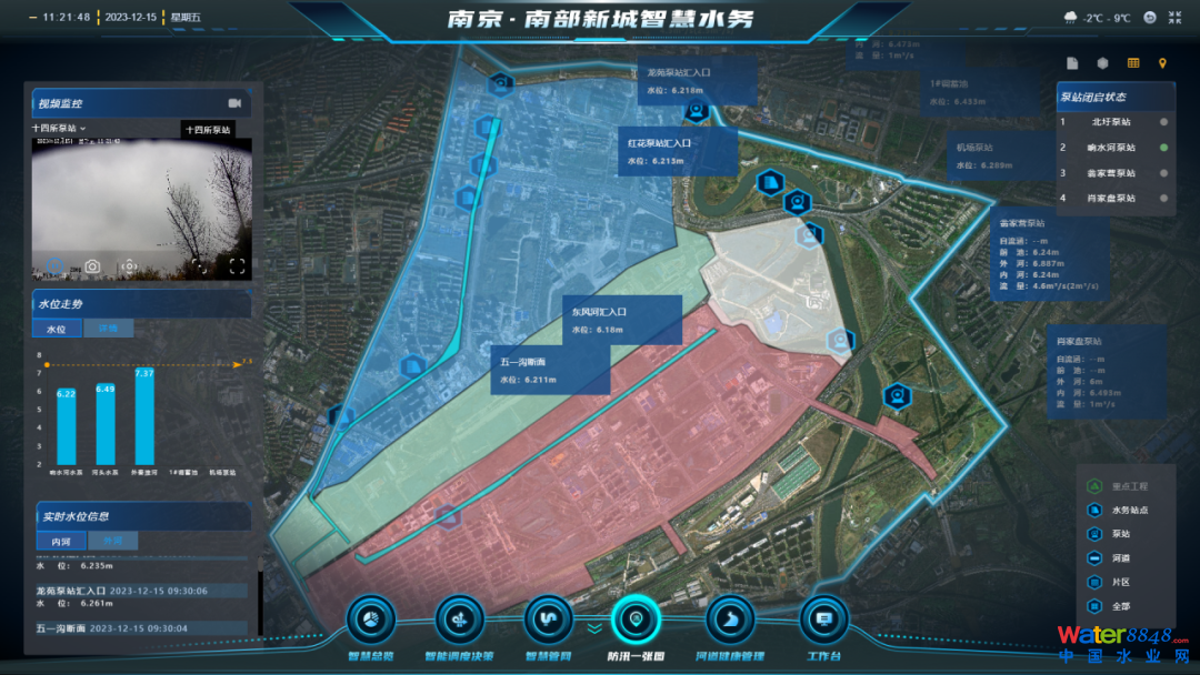 防汛指揮調(diào)度主要通過(guò)展示工地防汛監(jiān)控視頻,南部新城主要河道的水位走勢(shì),內(nèi)、外河實(shí)時(shí)水位信息等,輔助防汛決策和指揮調(diào)度。同時(shí),展示泵站閉啟狀態(tài)信息。防汛指揮調(diào)度如圖11所示。