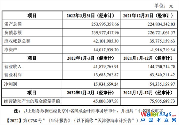 截止2022年3月31日,天津碧海的凈資產(chǎn)為1401.79萬元(合并口徑);2021年年末凈資產(chǎn)為-191.67萬元,出現(xiàn)了資不抵債;該年度營業(yè)收入為14475.02萬元,凈利潤5435.52萬元。2022年一季度凈資產(chǎn)得以轉為正數(shù),實現(xiàn)營業(yè)收入4187.98萬元、凈利潤1593.47萬元。