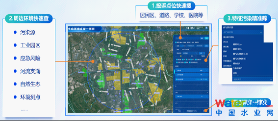 針對涉氣投訴占比大、重復率高、解決難度大的痛點,數(shù)字平臺構建了“風向關聯(lián)+空間穿透”的大氣污染溯源模型。以投訴點為中心,根據投訴特征描述融合120個專題圖層和污染源數(shù)據,以任意半徑、任意邊界自動檢索出所有涉廢氣排放且具有特定生產工藝、特定原輔材料、特征排放因子的污染源。結合擾民異味風向,通過系統(tǒng)線上組合條件分析,就能快速、精準地鎖定投訴企業(yè)。