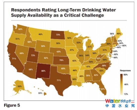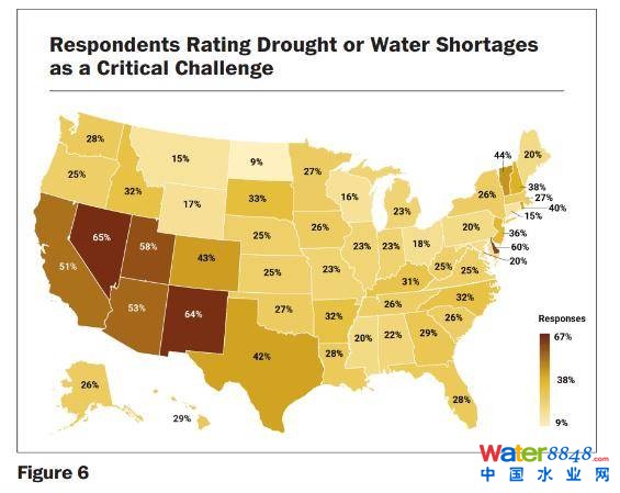 受訪(fǎng)者將長(zhǎng)期穩(wěn)定的飲用水供應(yīng)列為排名第二的挑戰(zhàn)。調(diào)查結(jié)果來(lái)看,57%的受訪(fǎng)者認(rèn)為這一點(diǎn)至關(guān)重要。下圖(左)顯示了美國(guó)各州的響應(yīng)情況,30%的受訪(fǎng)者認(rèn)為干旱氣候或周期性水資源短缺的影響是至關(guān)重要。下圖(右)也按州表示了這些響應(yīng),顯示這些關(guān)注點(diǎn)主要集中在西南部的州。雖然短缺和干旱主要是一個(gè)區(qū)域性問(wèn)題,但能夠?qū)崿F(xiàn)長(zhǎng)期穩(wěn)定的供應(yīng)是整個(gè)美國(guó)普遍關(guān)注的問(wèn)題。