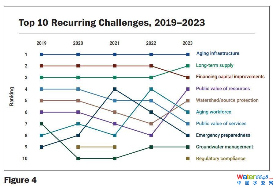 在2023年的調(diào)查中,受訪(fǎng)者被要求對(duì)20個(gè)水行業(yè)挑戰(zhàn)的嚴(yán)重性進(jìn)行評(píng)級(jí)。盡管在過(guò)去二十年中,影響水務(wù)行業(yè)的外部和內(nèi)部因素不斷發(fā)生變化,有時(shí)甚至是根本性的變化,但2023年調(diào)查確定的首要問(wèn)題與前幾年基本保持一致:商業(yè)或財(cái)務(wù)考慮、基礎(chǔ)設(shè)施、監(jiān)管和水源(上圖)。下圖顯示,自2019年以來(lái),老化基礎(chǔ)設(shè)施的修復(fù)/更換、資本改善融資和長(zhǎng)期穩(wěn)定的飲用水供應(yīng)維持了前三大挑戰(zhàn)的地位。自2019年以來(lái),其余7個(gè)優(yōu)先事項(xiàng)一直在波動(dòng),盡管每個(gè)優(yōu)先事項(xiàng)的平均排名差異很小。