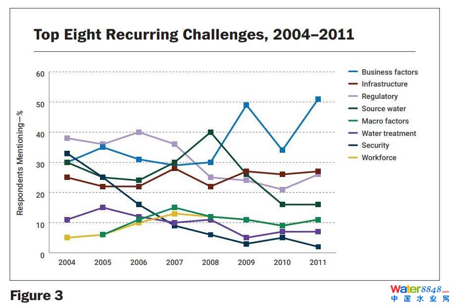 每年,AWWA都會(huì)要求受訪(fǎng)者對(duì)水行業(yè)面臨的挑戰(zhàn)的重要性進(jìn)行排名。最近的調(diào)查要求受訪(fǎng)者對(duì)他們認(rèn)為的每個(gè)挑戰(zhàn)進(jìn)行重要性排序,從不重要到極其重要。