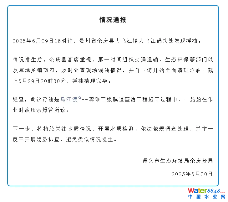 通報稱,2025年6月29日16時許,貴州省余慶縣大烏江鎮(zhèn)大烏江碼頭處發(fā)現(xiàn)浮油。