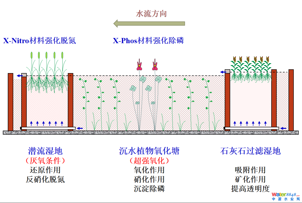 針對污水處理廠尾水深度凈化提標(biāo)的問題,研創(chuàng)了新型強(qiáng)化復(fù)合人工濕地工藝,研制了X-Nitro材料作為反硝化緩釋碳源,以及X-Phos材料輔助用于強(qiáng)化沉水植物氧化塘的除磷效果,濕地出水能夠穩(wěn)定達(dá)到地表III類水標(biāo)準(zhǔn)。目前技術(shù)應(yīng)用于河南駐馬店、湖北咸寧經(jīng)濟(jì)開發(fā)區(qū)和石家莊等多個(gè)污水廠尾水深度凈化濕地工程。
