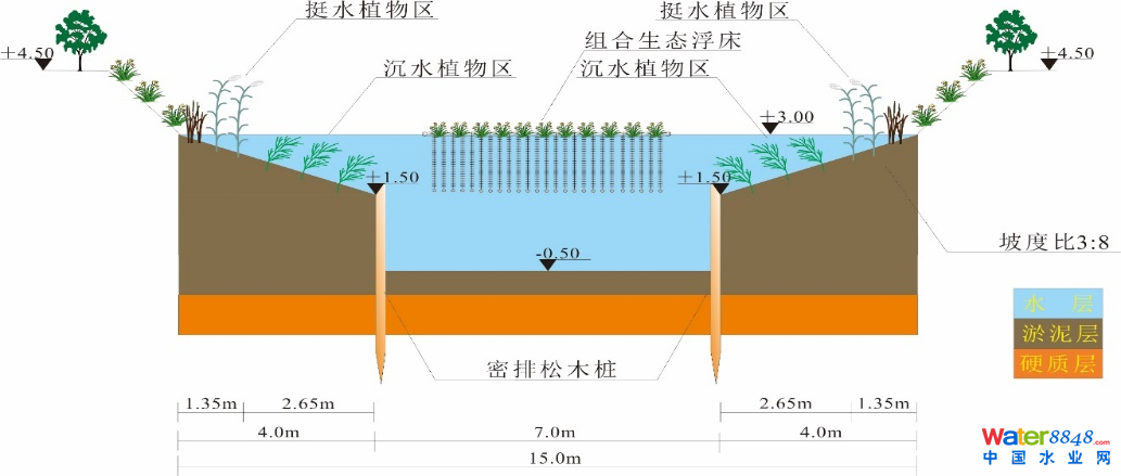 新型強(qiáng)化復(fù)合人工濕地工藝總停留時(shí)間3d,總水力負(fù)荷0.15m3/㎡/d,出水達(dá)到地表III類標(biāo)準(zhǔn)(GB3838-2002)。