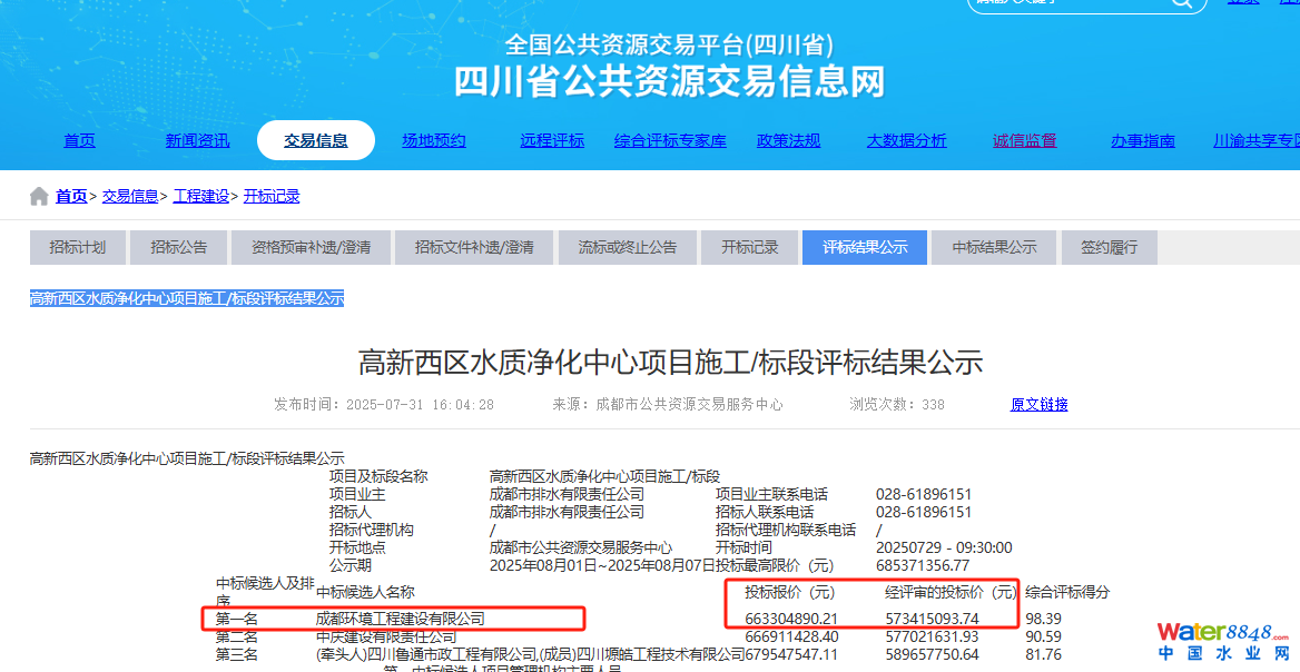 近日,中國水網(wǎng)從E20環(huán)境平臺標訊采集系統(tǒng)E標通獲悉,四川省成都高新西區(qū)水質(zhì)凈化中心項目施工 / 標段評標結(jié)果公示,公示顯示,成都環(huán)境工程建設(shè)有限公司以573415093.74元的價格成為該項目的第一中標候選人。