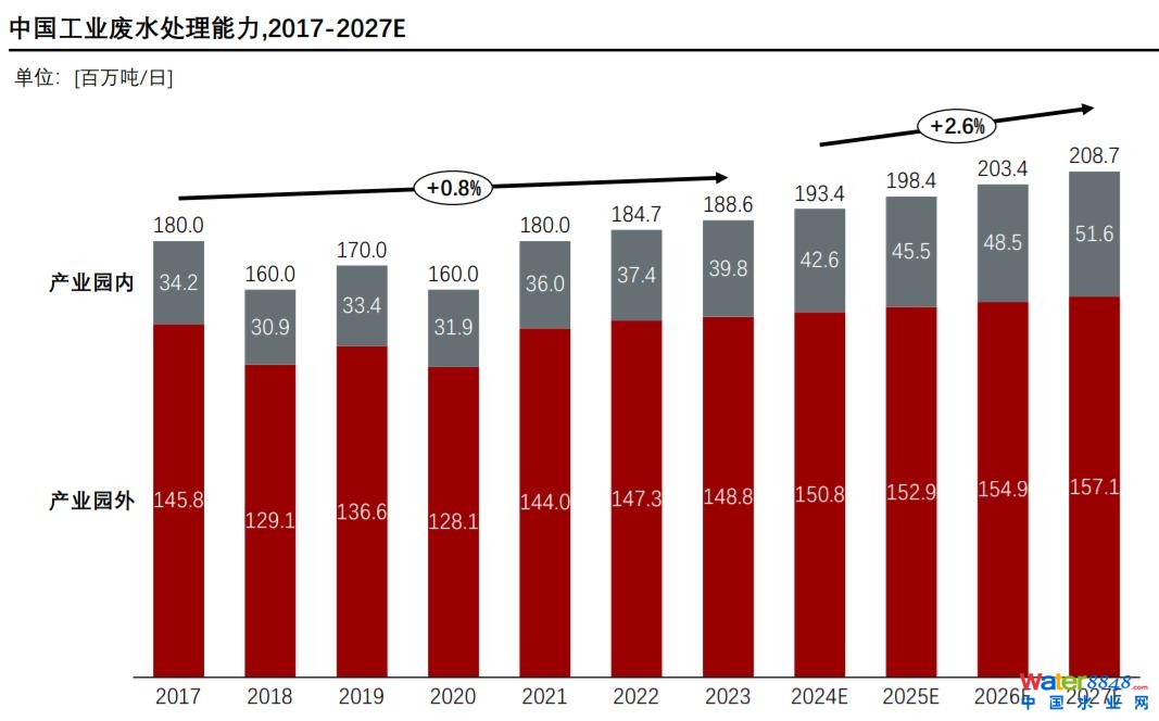 產(chǎn)業(yè)園內(nèi)工業(yè)廢水處理能力在2023年占比為21.1%,而2017年為19.0%,預(yù)計(jì)到2027年該比例將增至24.79%。