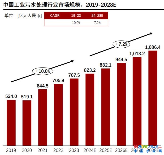 2023年中國(guó)工業(yè)污水處理行業(yè)市場(chǎng)規(guī)模為767.5億元人民幣,行業(yè)規(guī)模自2020年以來(lái)逐年攀升,2019-2023年均復(fù)合增長(zhǎng)率為10.0%,預(yù)計(jì)2024年市場(chǎng)將持續(xù)增長(zhǎng)至823.2億元人民幣。