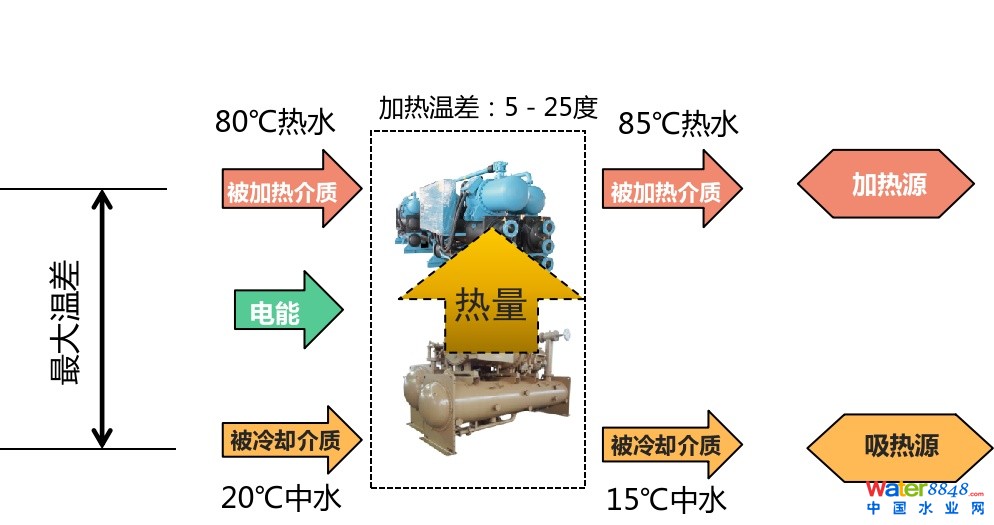 水源熱泵是一種以中水為低溫?zé)嵩,借助壓縮機(jī)及其中制冷劑(冷媒)的相變,通過(guò)消耗少量電能,實(shí)現(xiàn)對(duì)外供熱的成套設(shè)備,主要由壓縮機(jī)、蒸發(fā)器、冷凝器、節(jié)流裝置等部件組成。